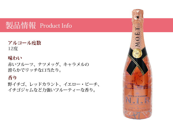 【産地】 フランス 【生産者】 モエ・エ・シャンドン 【度数】 12度 【内容量】 750ml1743年、クロード・モエによって創立されたモエ・エ・シャンドンは、270年以上の歴史を誇るシャンパーニュ地方のメゾンです。