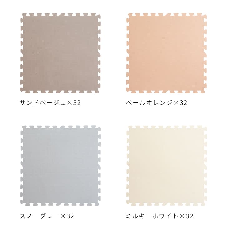 商品サイズ 幅60×奥行き60×厚み1cm/1枚 ※サイドパーツ片側取り付け時 内寸:幅54.5×奥行き54.5cm 外寸:幅60×奥行き60cm材質 EVA・耐熱温度約80度 カラー サンドベージュ / ペールオレンジ / スノーグレー / ミルキーホワイト 備考 32枚セット / サイドパーツ64枚 ※マット一枚につきサイドパーツ2枚付属 注意事項 お買い物の際は、会社概要の「その他の注意点」を必ずご確認ください。