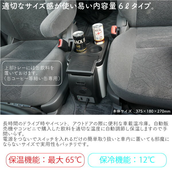 商品名 車載 冷蔵庫 保温庫 6L 軽量1.8k 保冷温庫 小型 ポータブル シガー電源 12V ミニ冷蔵庫 保温庫 保冷ボックス 保温ボックス カー用品 商品説明 350ml缶が6本入る6Lサイズ。